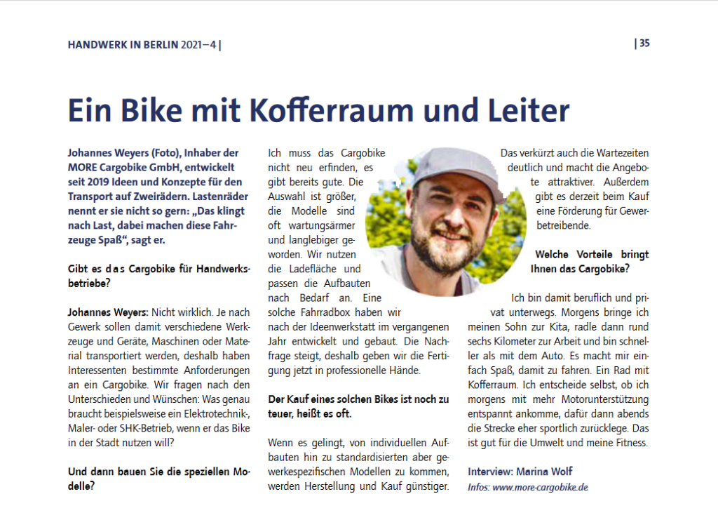 In der aktuellen Dezemberausgabe wurde im Magazin der Berliner Handwerkskammer über MORE Cargobike berichtet.