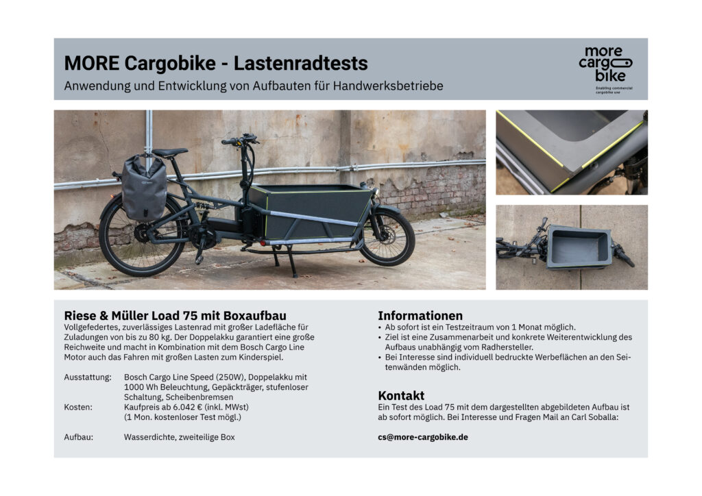 Für die Tests nutzen wir derzeit mehrere Load 75 von Riese & Müller. Durch den Bosch Antrieb, Vollfederung und weiteren hochwertigen Komponenten ist das Rad sehr langlebig, wartungsarm und ein echter Allrounder.